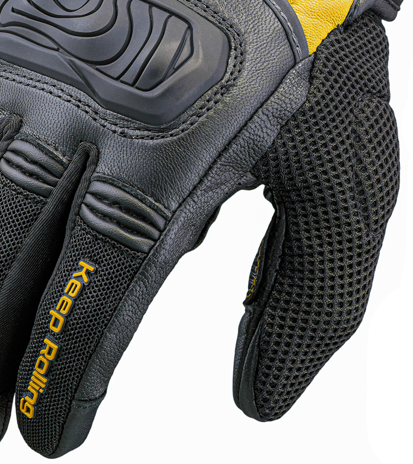 Racing gloves are built for maximum protection and control, incorporating premium leather reinforced with materials like Kevlar or carbon, as well as hard knuckle guards, finger bridges, scaphoid sliders, and a snug fit to withstand high speeds and impact.